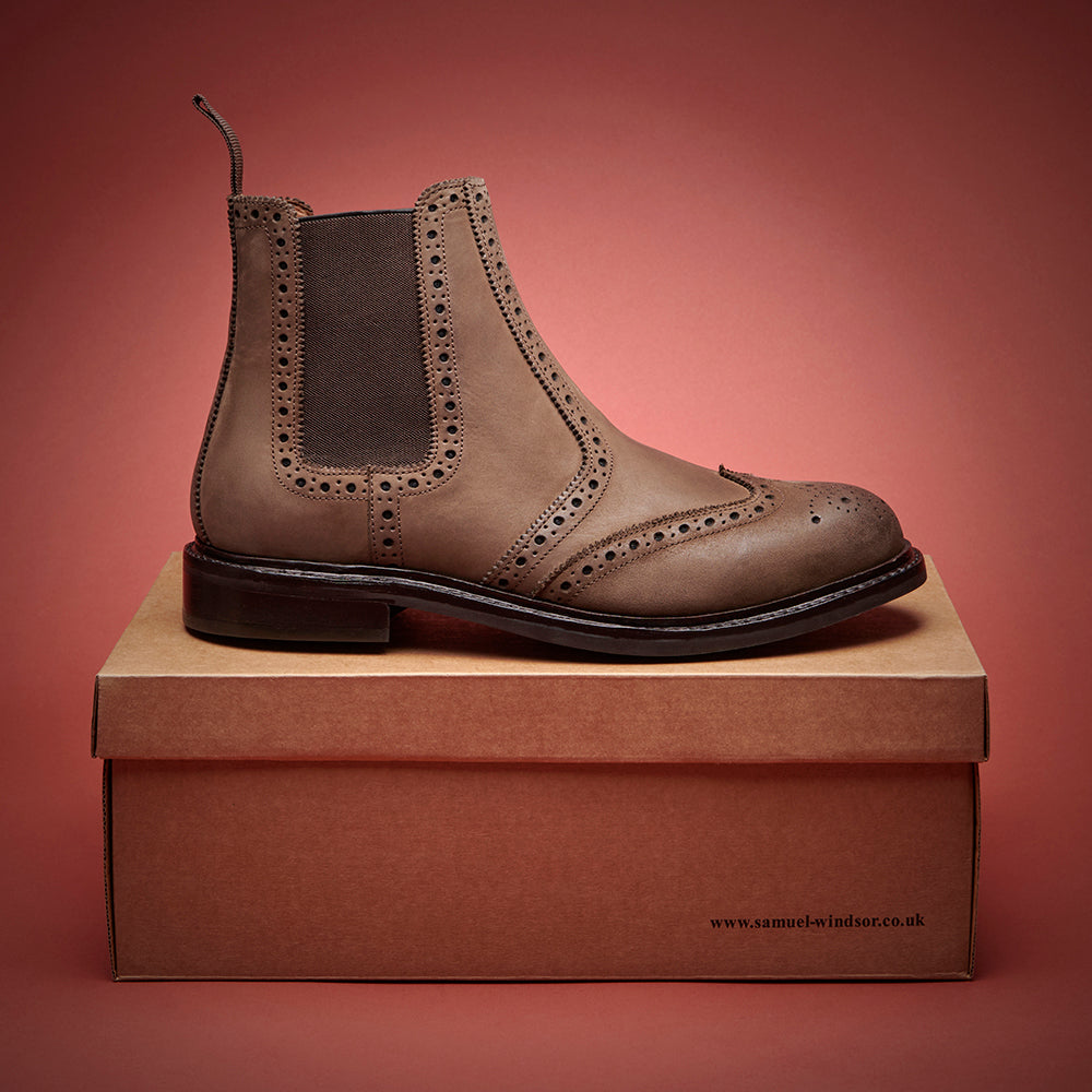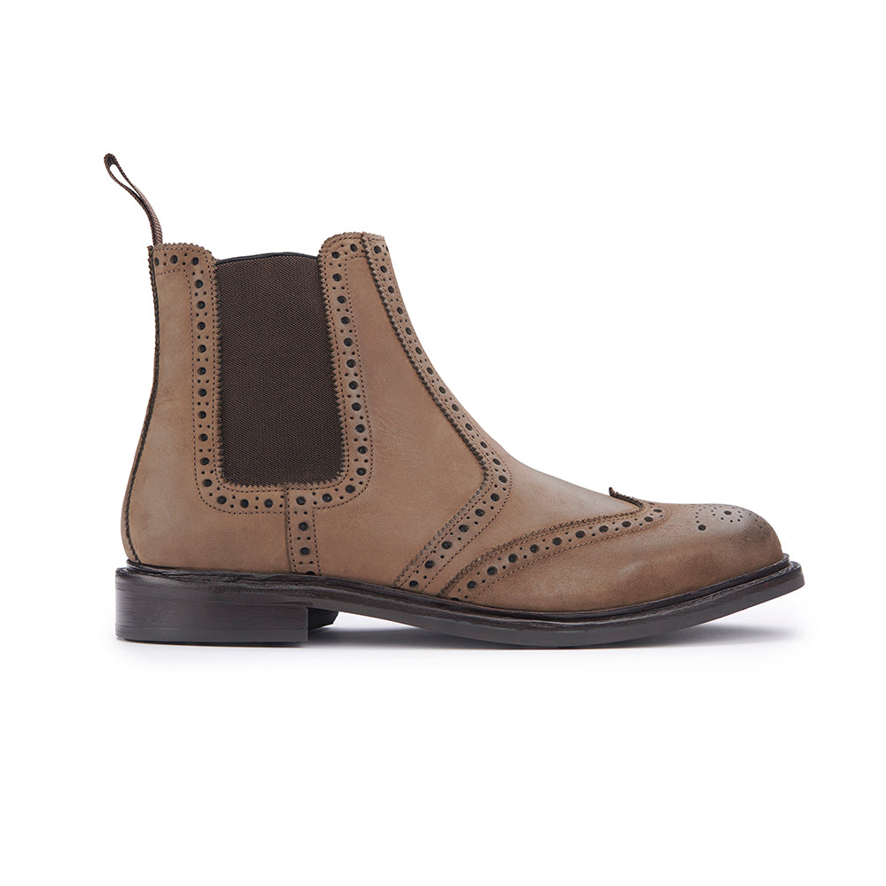 A rugged twist on a timeless classic, this Brogue Chelsea Dealer Boot combines traditional detailing with modern practicality. Crafted from premium leather and finished with full brogue perforations, it offers a unique blend of refinement and durability.