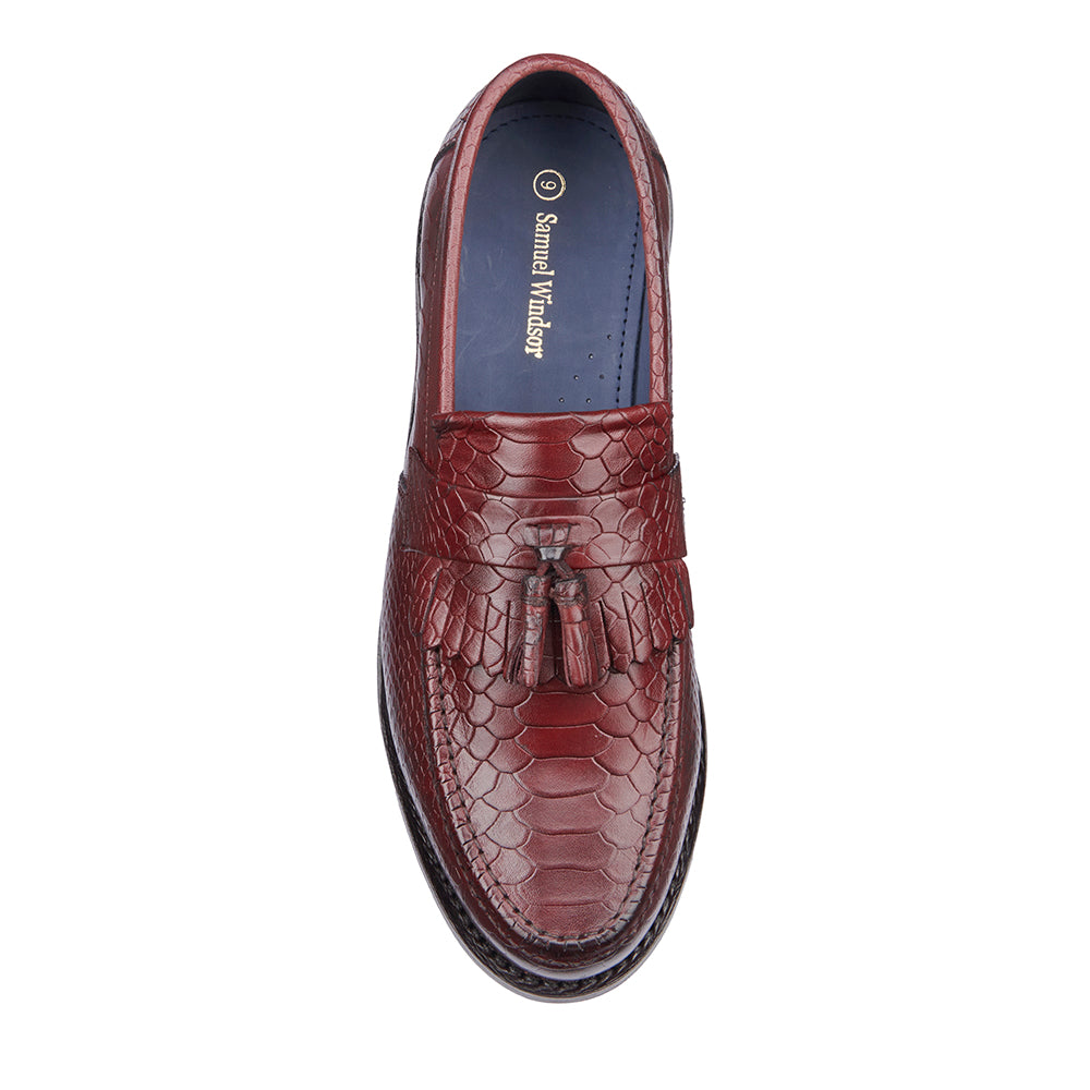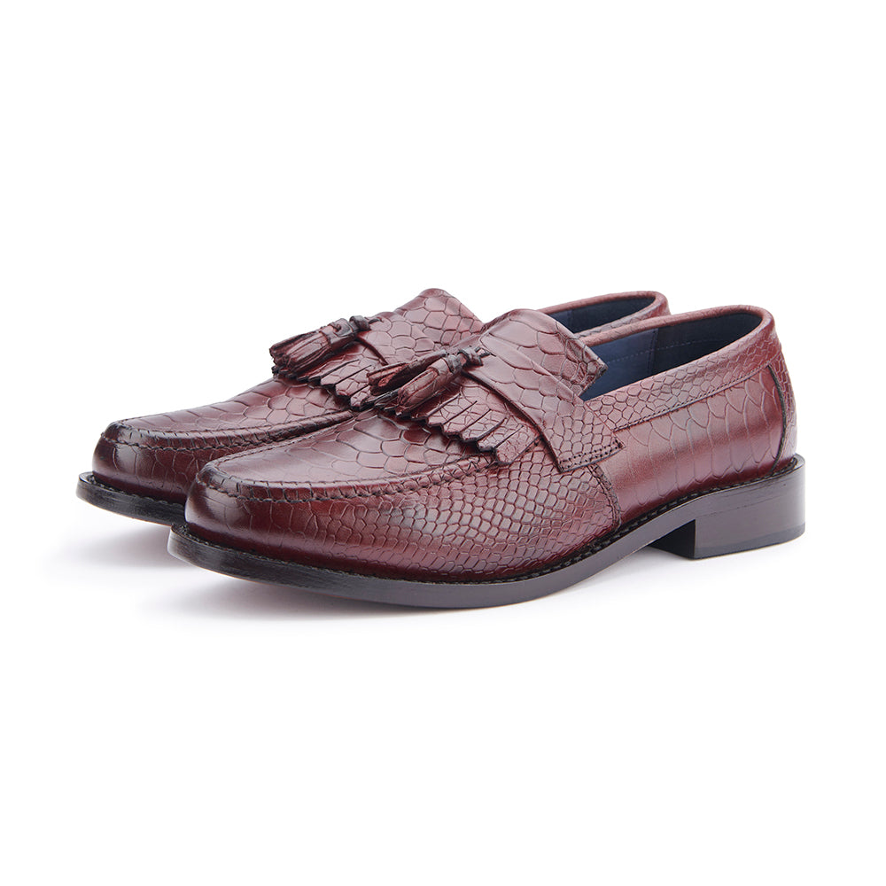 Crafted from top-grain leather with multiple layers of wax resonated into the hide, our new oxblood crocodile-pattern finish delivers a rich depth of colour and texture. This striking design elevates the traditional loafer to another level, offering a bold yet refined statement.